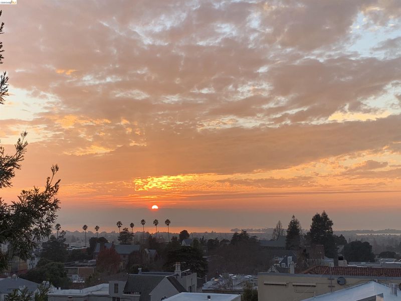 Beautiful light-filled top-floor condo in prime North Berkeley with views of the Bay & Golden Gate Bridge. The sunsets are incredible! Tall ceilings and expansive sliding glass windows create an airy feel throughout. The kitchen opens to the dining area, and the living area leads to a large private balcony, perfect for dining or relaxing while enjoying the views. The spacious bedroom has wonderful views of the Bay. An optional room divider in the main living space is ideal for a bonus room, office, or guest area. Elevator building with secure parking, storage, and beautifully maintained common areas. Ideally located near UC Berkeley, shops, cafes, and transportation.