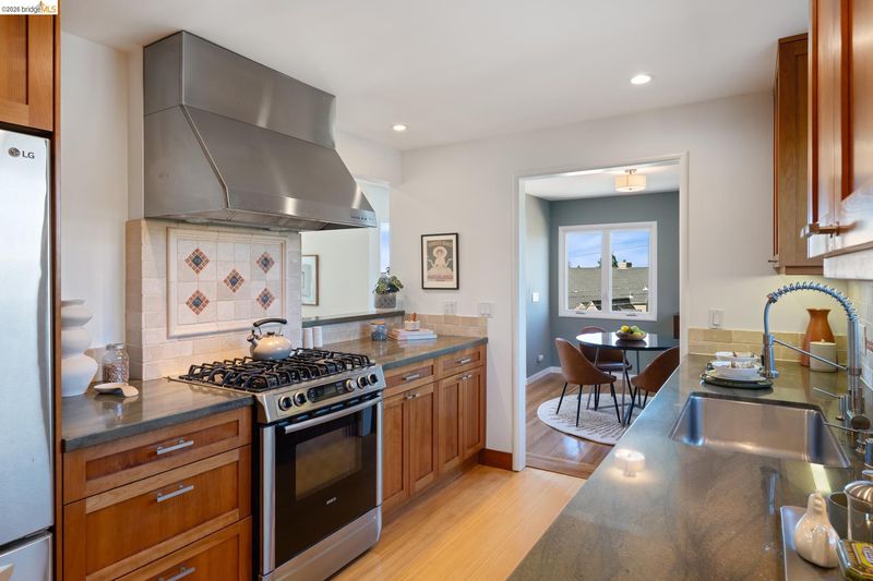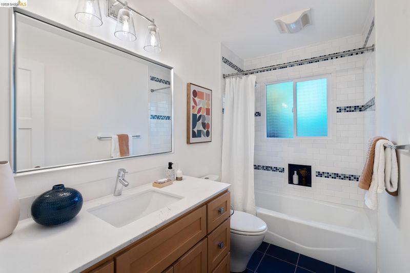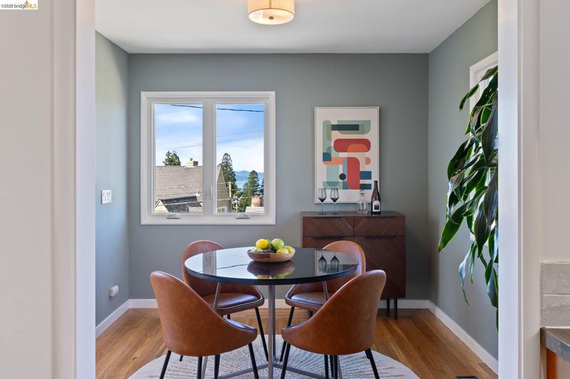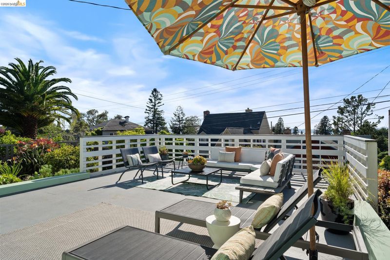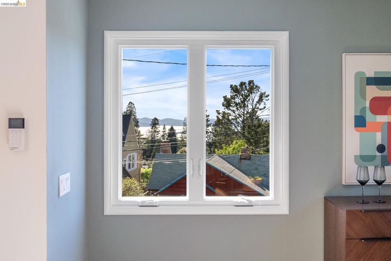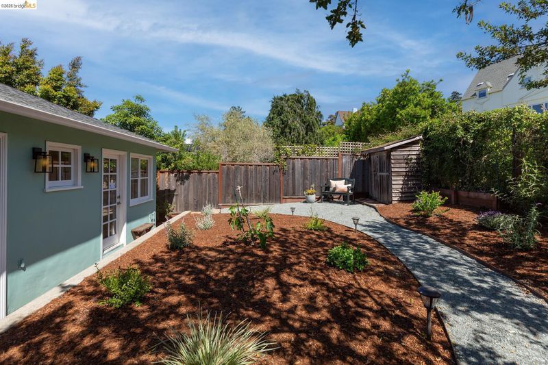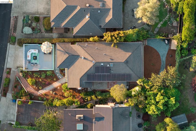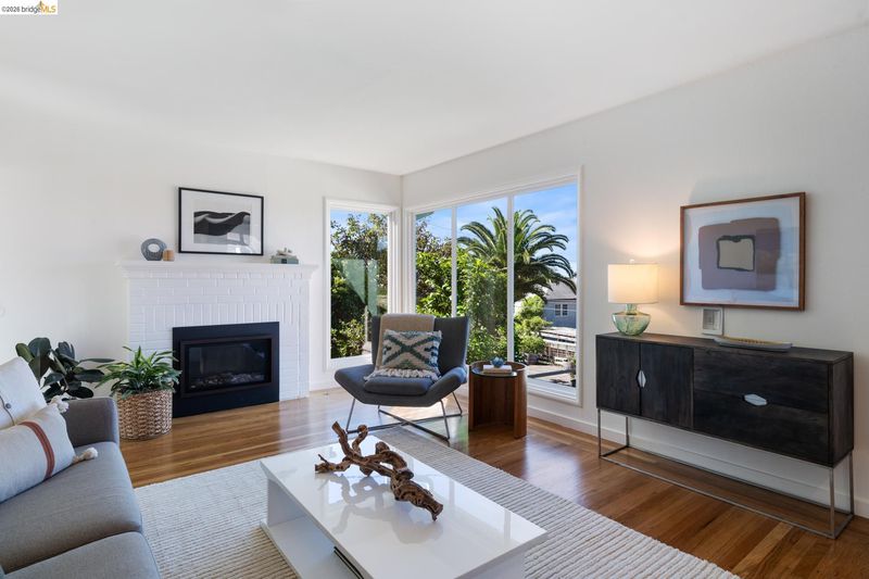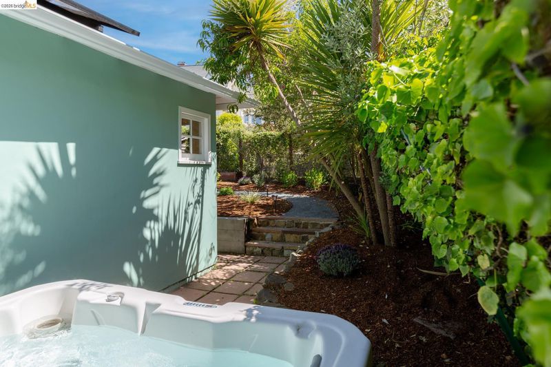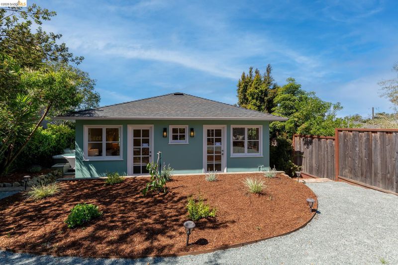 Set above the street on a quiet cul-de-sac, this home offers exceptional privacy with convenient access to nearby amenities. Living room features floor-to-ceiling windows, a gas fireplace with remote, and French doors opening to a private hot tub. Designer colors, updated lighting, and a seamless layout connect the living, dining, and kitchen spaces. Kitchen has extra-deep stone countertops, shaker cabinetry, stainless steel appliances, and side yard access Short flight of steps leads to three bedrooms and two baths, including a primary suite with backyard access and a beautifully updated bath with an oversized glass-enclosed shower. Level backyard is sunny and bordered by mature trees. Above the detached two-car garage, a spacious rooftop deck offers bay views and a perfect setting for entertaining. Additional features include a newer Mitsubishi heat pump, updated electrical with new wiring, solar panels (owned), new EV car charger, resurfaced garage rooftop deck, and partial basement for storage. Sewer lateral is in compliance. Close to Kensington Park, schools, trails, and local amenities. OPEN HOUSES: 4/9 (9:30-12:30), 4/11 & 4/12 (2:00-4:00).