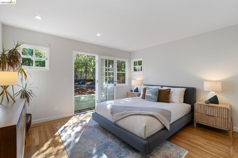 Set above the street on a quiet cul-de-sac, this home offers exceptional privacy with convenient access to nearby amenities. Living room features floor-to-ceiling windows, a gas fireplace with remote, and French doors opening to a private hot tub. Designer colors, updated lighting, and a seamless layout connect the living, dining, and kitchen spaces. Kitchen has extra-deep stone countertops, shaker cabinetry, stainless steel appliances, and side yard access Short flight of steps leads to three bedrooms and two baths, including a primary suite with backyard access and a beautifully updated bath with an oversized glass-enclosed shower. Level backyard is sunny and bordered by mature trees. Above the detached two-car garage, spacious rooftop deck offers bay views and a perfect setting for entertaining. Additional features include a newer Mitsubishi heat pump, updated electrical with new wiring, solar panels (owned), new EV car charger, resurfaced garage rooftop deck, and partial basement. Sewer lateral compliant.